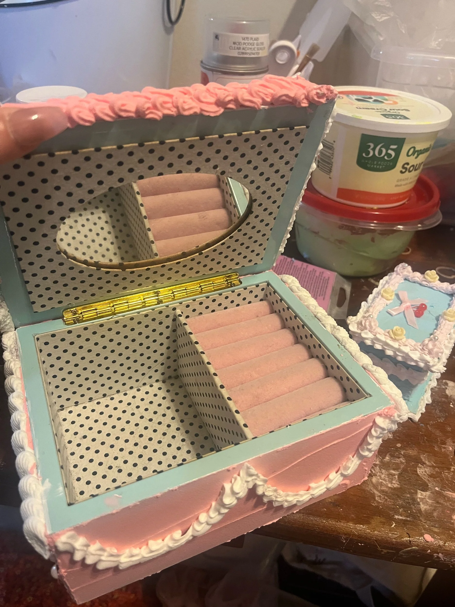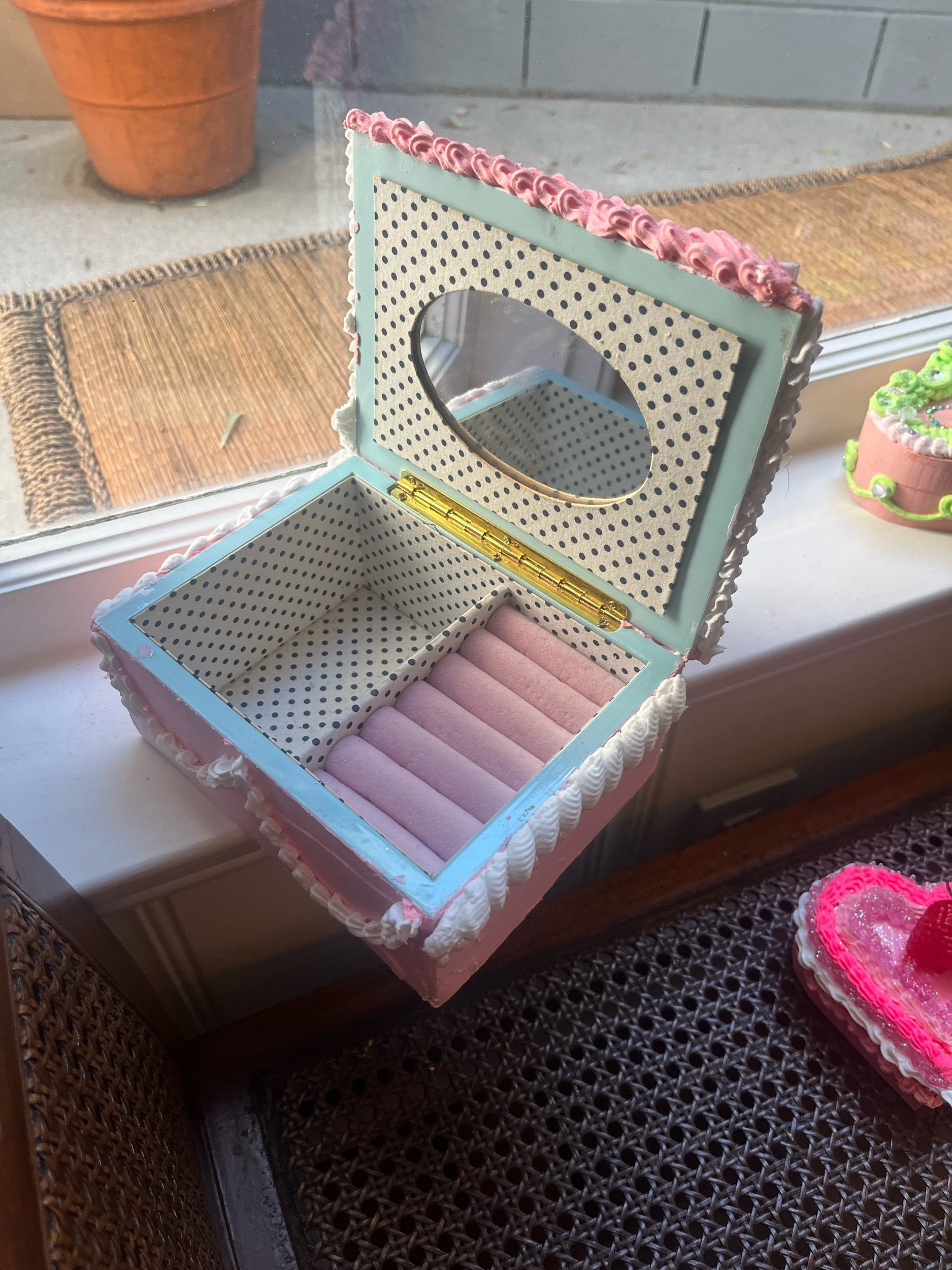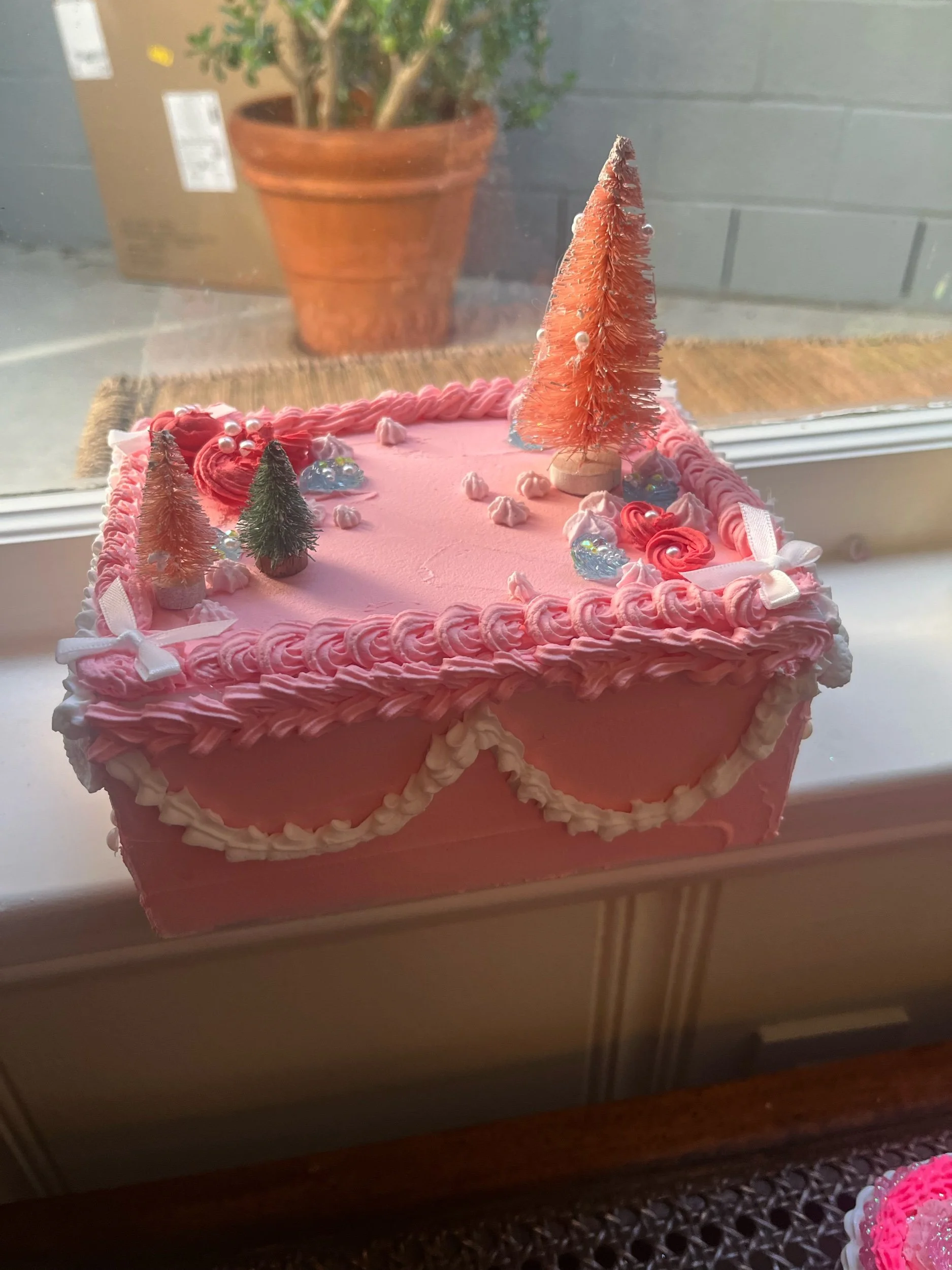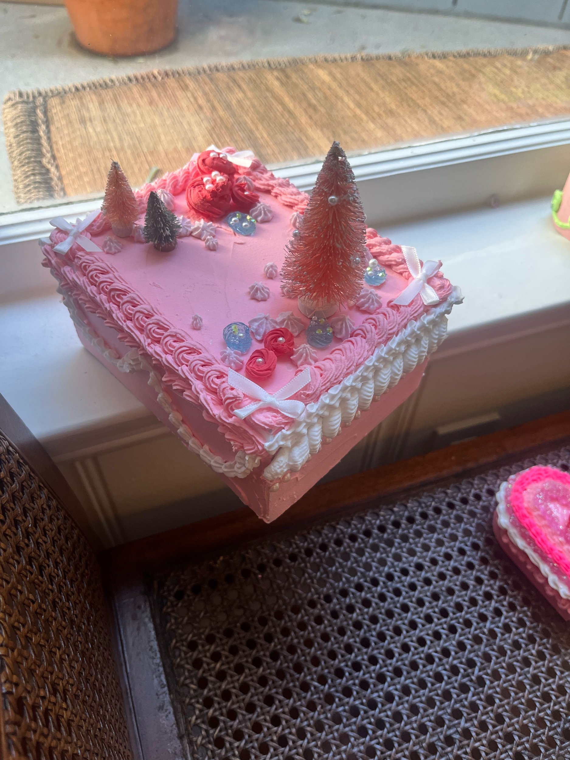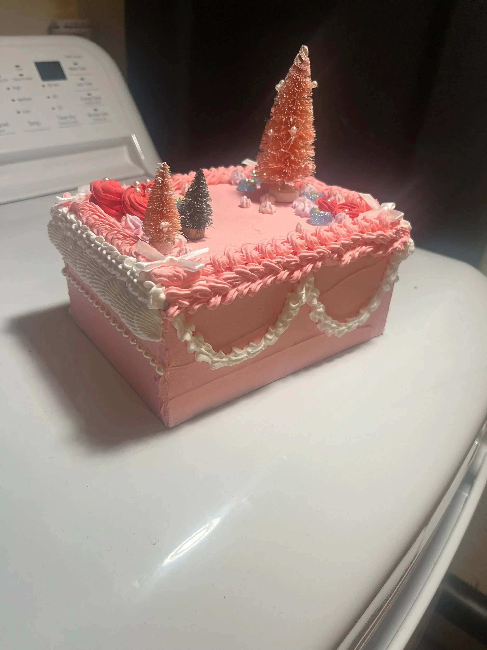 Shop › Pink Xmas jewelry cake box Image 1 of 6 Image 2 of 6 Image 3 of 6 Image 4 of 6 Image 5 of 6 Image 6 of 6 Pink Xmas jewelry cake box $50.00 It’s an up-cycled jewelry box But it also looks like a cake The trees makes it “xmas” Price includes shipping Add To Cart Added! It’s an up-cycled jewelry box But it also looks like a cake The trees makes it “xmas” Price includes shipping