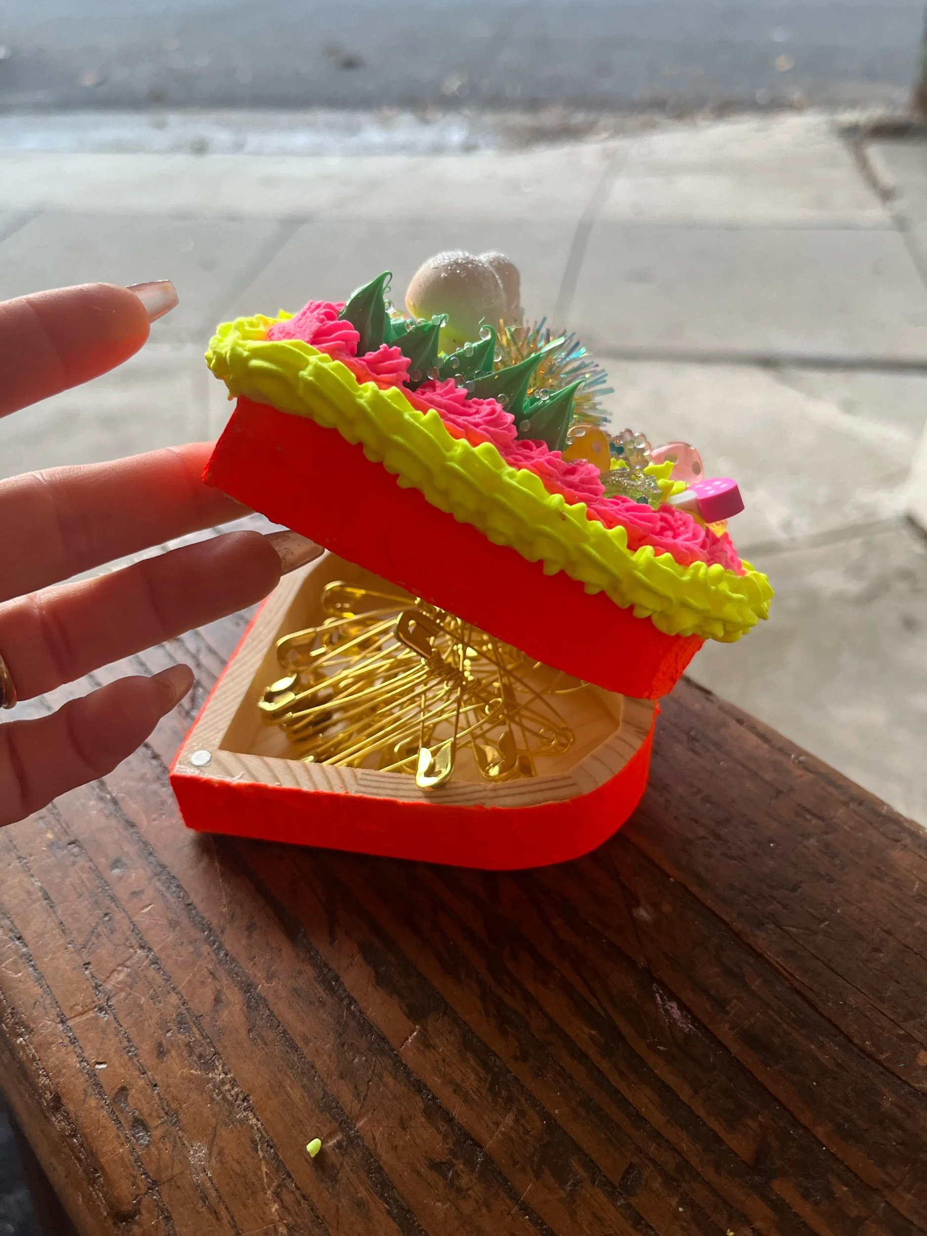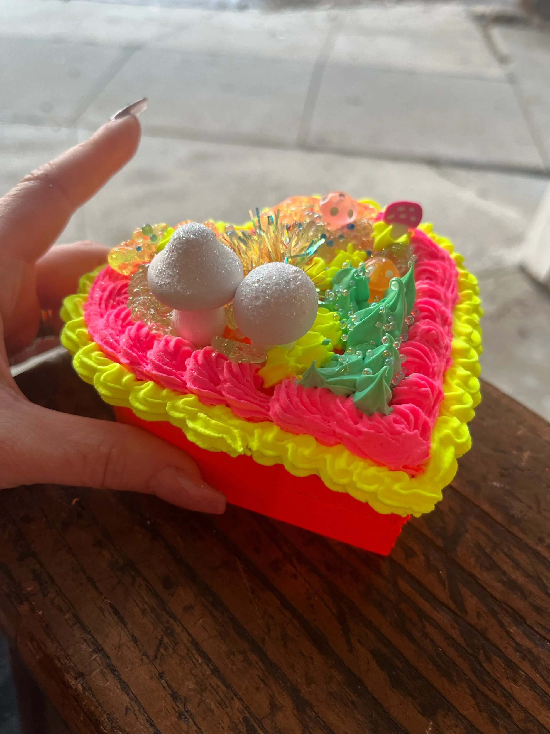 Shop › “Dewdrops in the Garden” cake box Image 1 of 5 Image 2 of 5 Image 3 of 5 Image 4 of 5 Image 5 of 5 “Dewdrops in the Garden” cake box $46.00 SHIPPING INCLUDED IN PRICE wooden heart shaped cake box. Good for safety pins or matchbooks. Add To Cart Added! SHIPPING INCLUDED IN PRICE wooden heart shaped cake box. Good for safety pins or matchbooks.